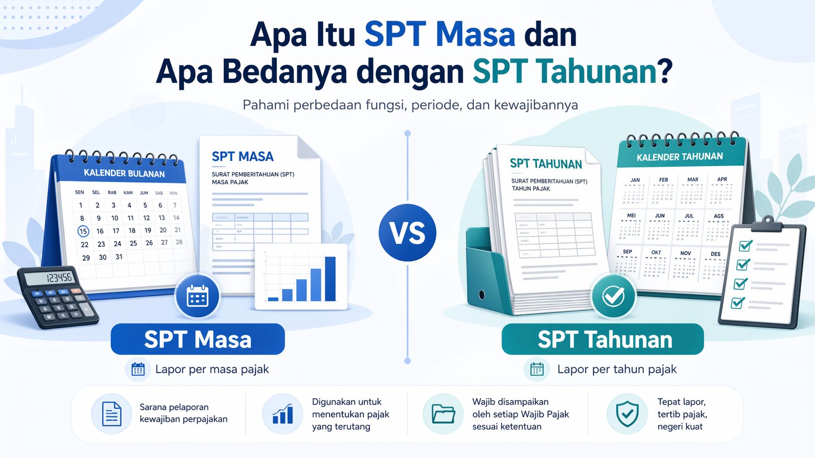 Masih bingung membedakan SPT Masa dan SPT Tahunan? Anda tidak sendirian. Banyak wajib pajak yang masih keliru memahami keduanya, padahal perbedaannya sangat penting agar tidak telat lapor atau kena denda. Artikel ini akan menjelaskan secara lengkap pengertian, fungsi, periode pelaporan, perbedaan utama, serta contoh kewajiban berdasarkan jenis wajib pajak.